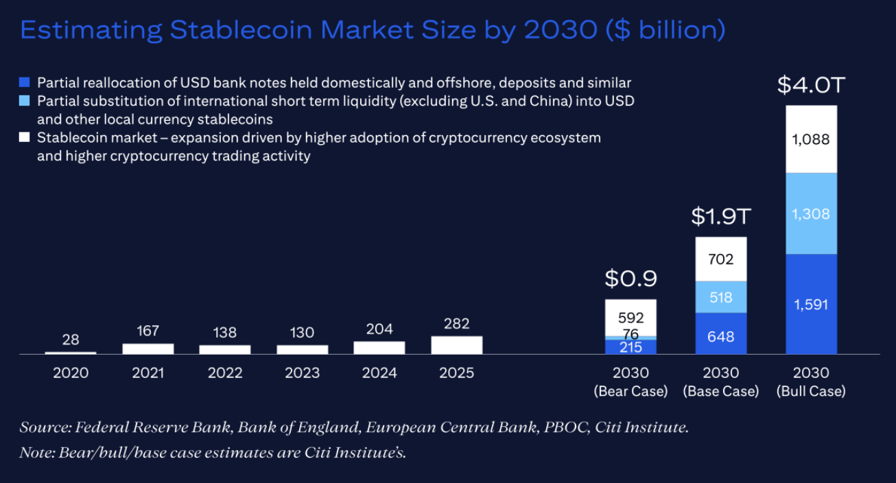 🇺🇸 Citi GPS - Stablecoins 2030. Citi considera ahora que 2025 será el «momento ChatGPT» de la cadena de bloques, impulsado por la creciente adopción de las monedas estables y el interés institucional. La emisión ha pasado de 200 000 millones de dólares a 280 000 millones este año, lo que ha llevado a revisar al alza las previsiones hasta 1,9 billones (base) y 4 billones (caso alcista). Aunque las monedas estables son prometedoras, Citi espera que los tokens emitidos por los bancos acaben dominando el mercado en 2030.