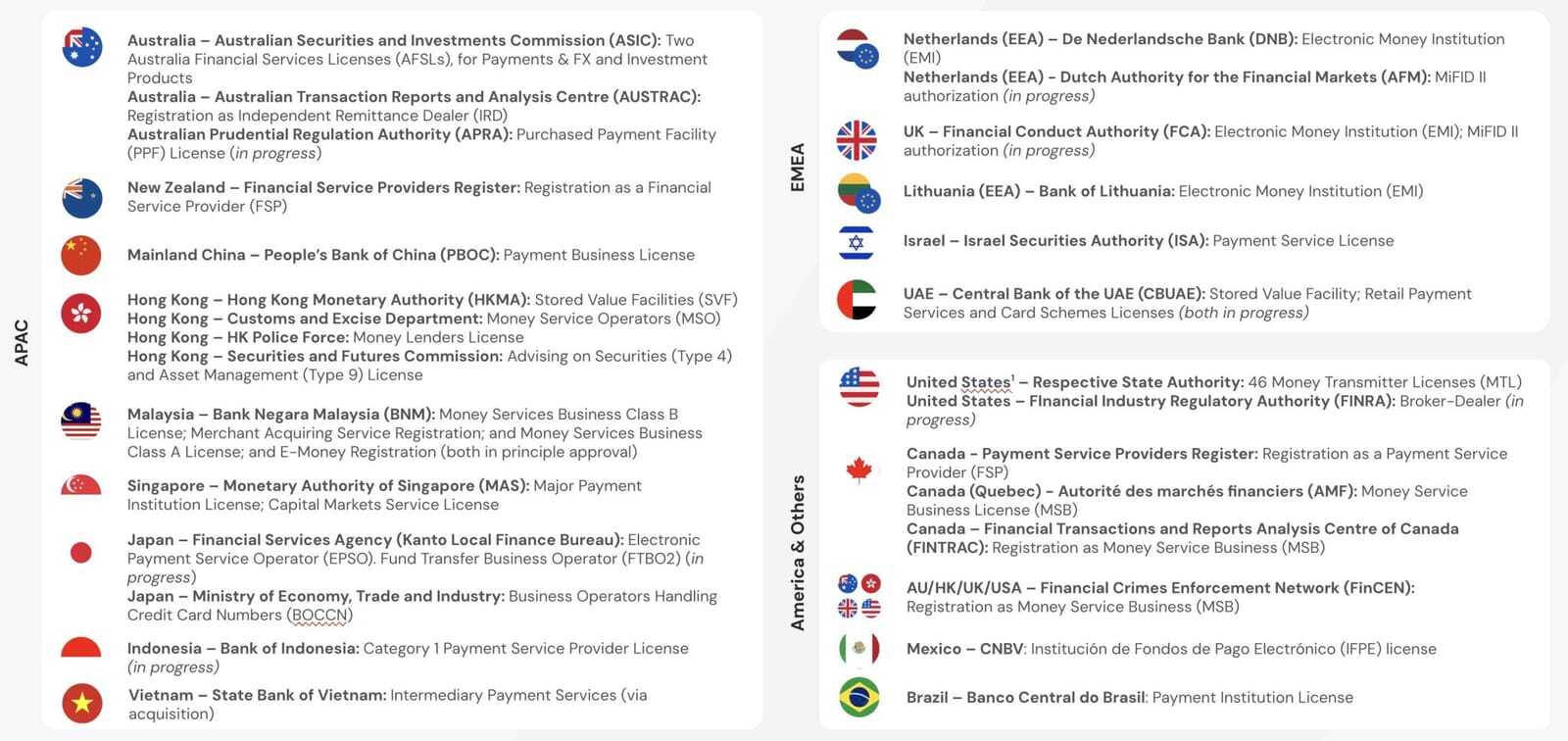 Airwallex cuenta con más de 60 licencias financieras y registros reglamentarios en todo el mundo, en Estados Unidos, Reino Unido, Unión Europea, China, Asia-Pacífico y Latinoamérica.